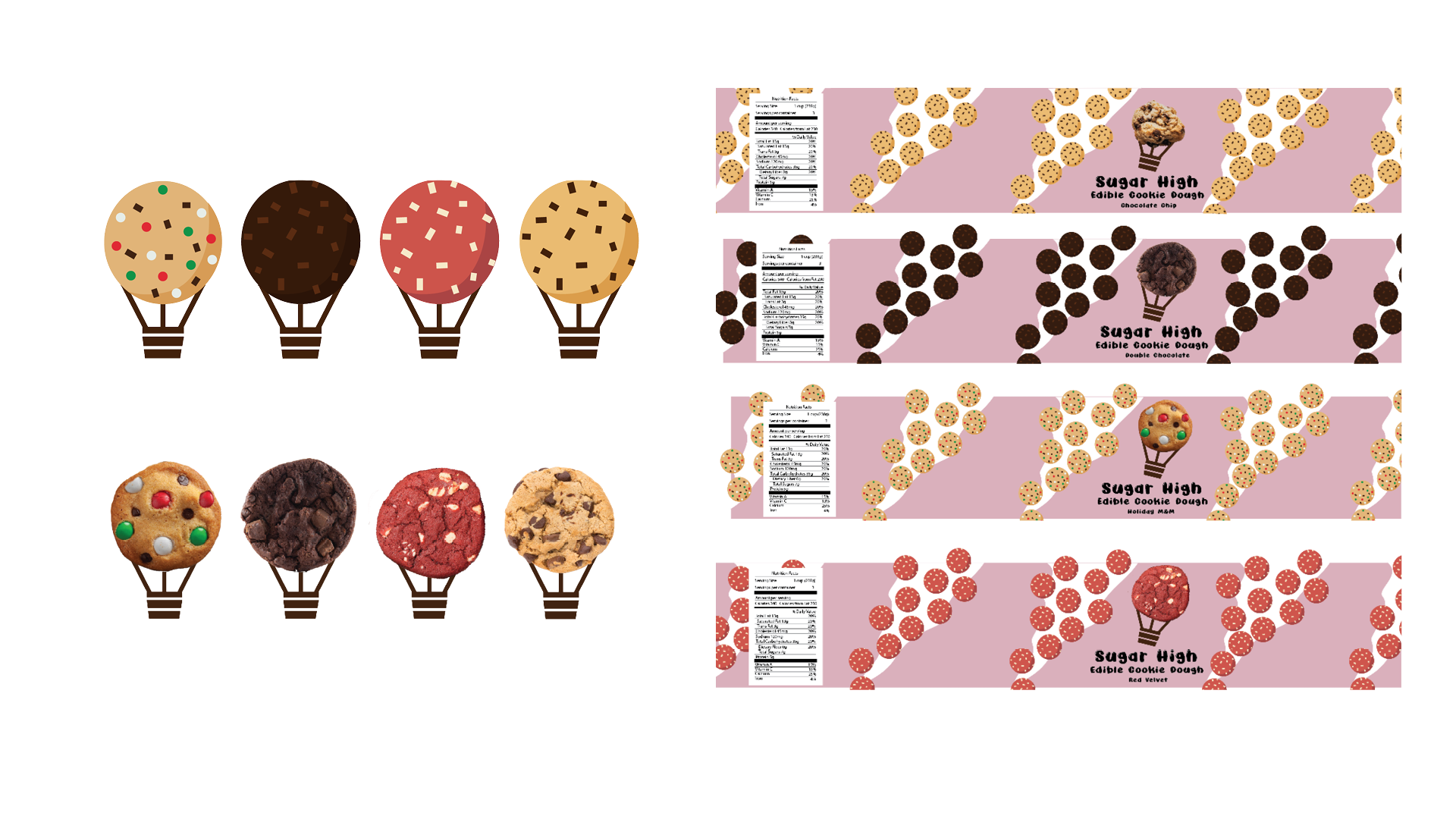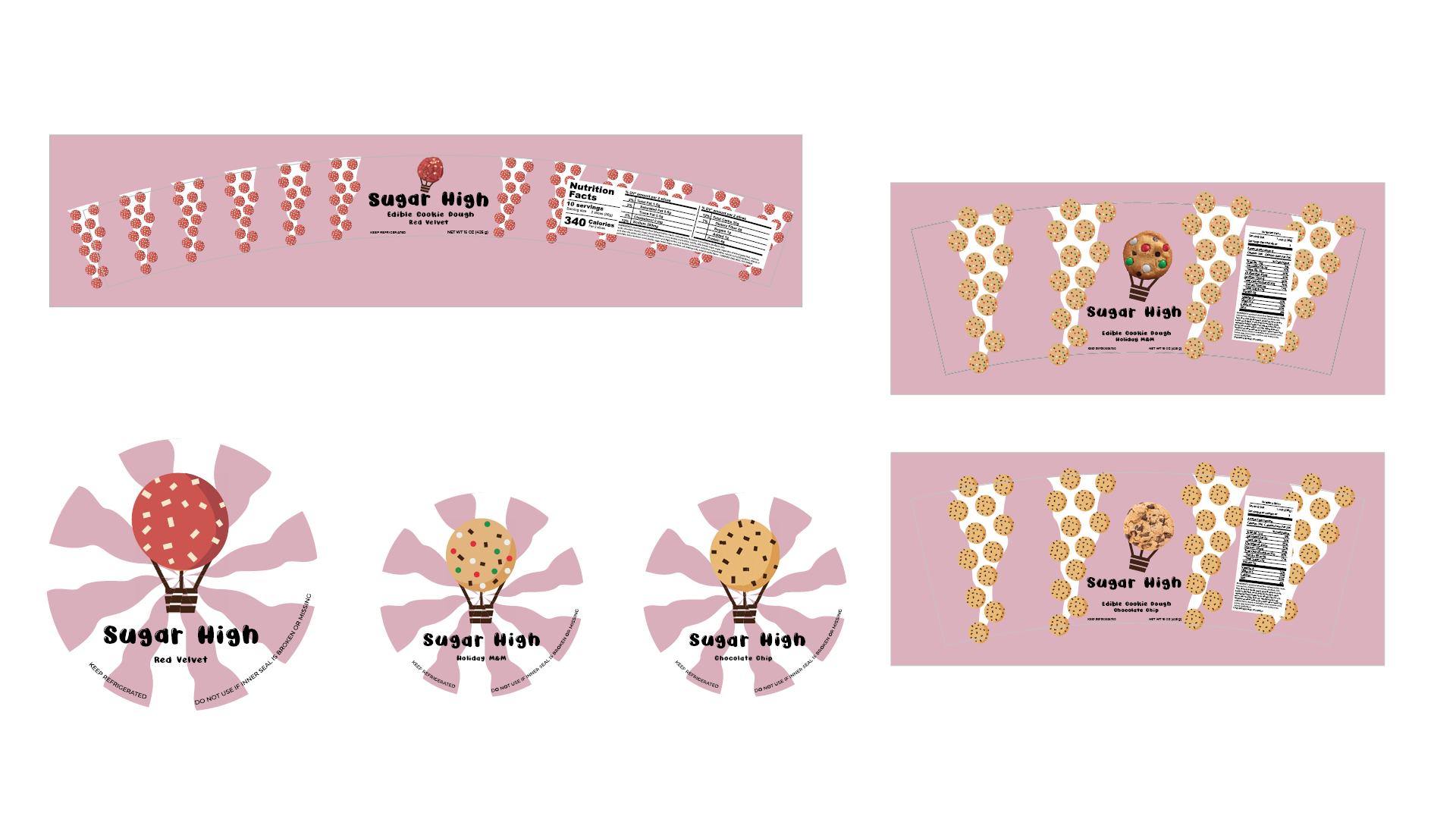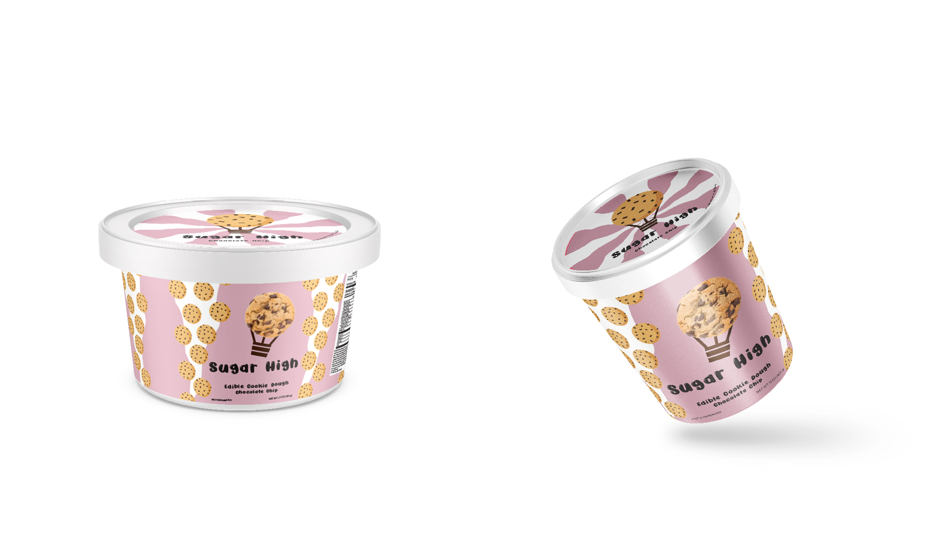 Packaging design and advertisement for the brand Sugar High. Sugar High is an edible cookie dough brand focused on resonating with childhood memories.